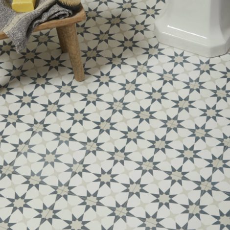 With its decorative starburst design, Atlas is a porcelain tile that can be used indoors or out, to create a statement look underfoot. It’s perfect for kitchens, bathrooms, hallways and porches and can be used to enhance a Victorian or period property with its heritage look and feel. Use in an otherwise neutral scheme to make instant impact or as a contrasting element in a colourful interior.